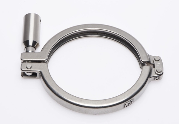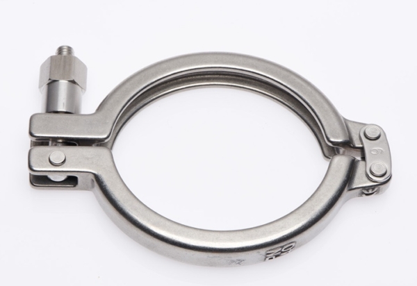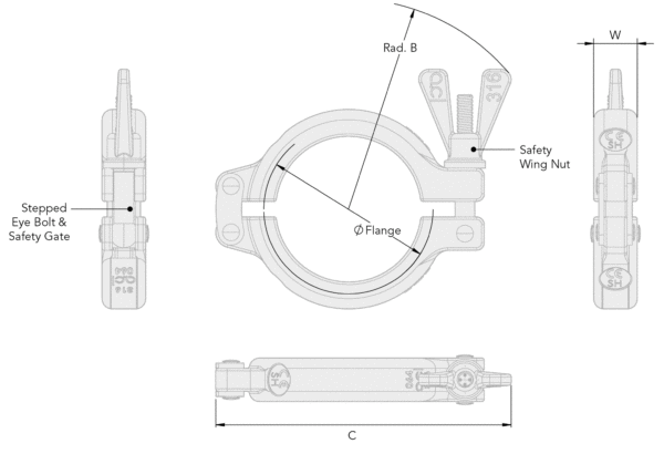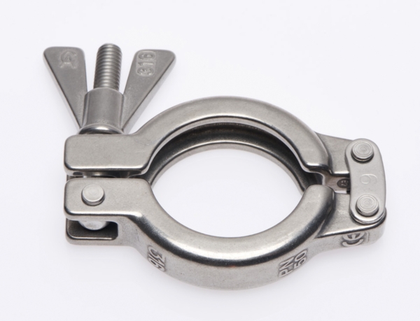 Double hinge pharmaceutical clamp The new SH Safety Clamp is based on the design of the widely accepted 316 stainless steel SH clamp, designed and manufactured by Advanced Couplings Ltd, which includes the ‘Omega’ internal profile geometry known for its exceptional clamping efficiency. The SH style Safety Clamp’s unique feature is the lower portion of the bolt is wider than the opening in the clamp’s gate. In use, the wing nut must be deliberately loosened so the clamp gate can be lifted above the wider part of the bolt before the clamp can be completely opened.